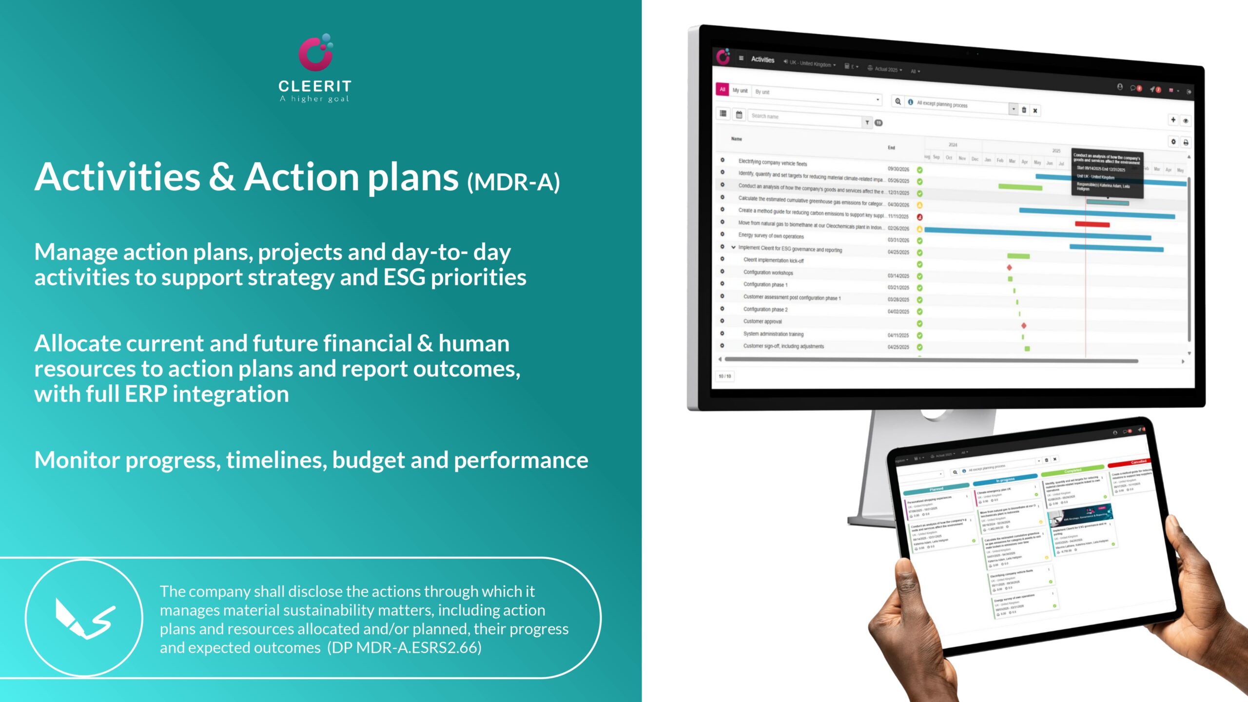 Connect material ESG topics to policies, targets, actions and metrics, and manage your sustainability roadmap with activity, resource, time and task planning