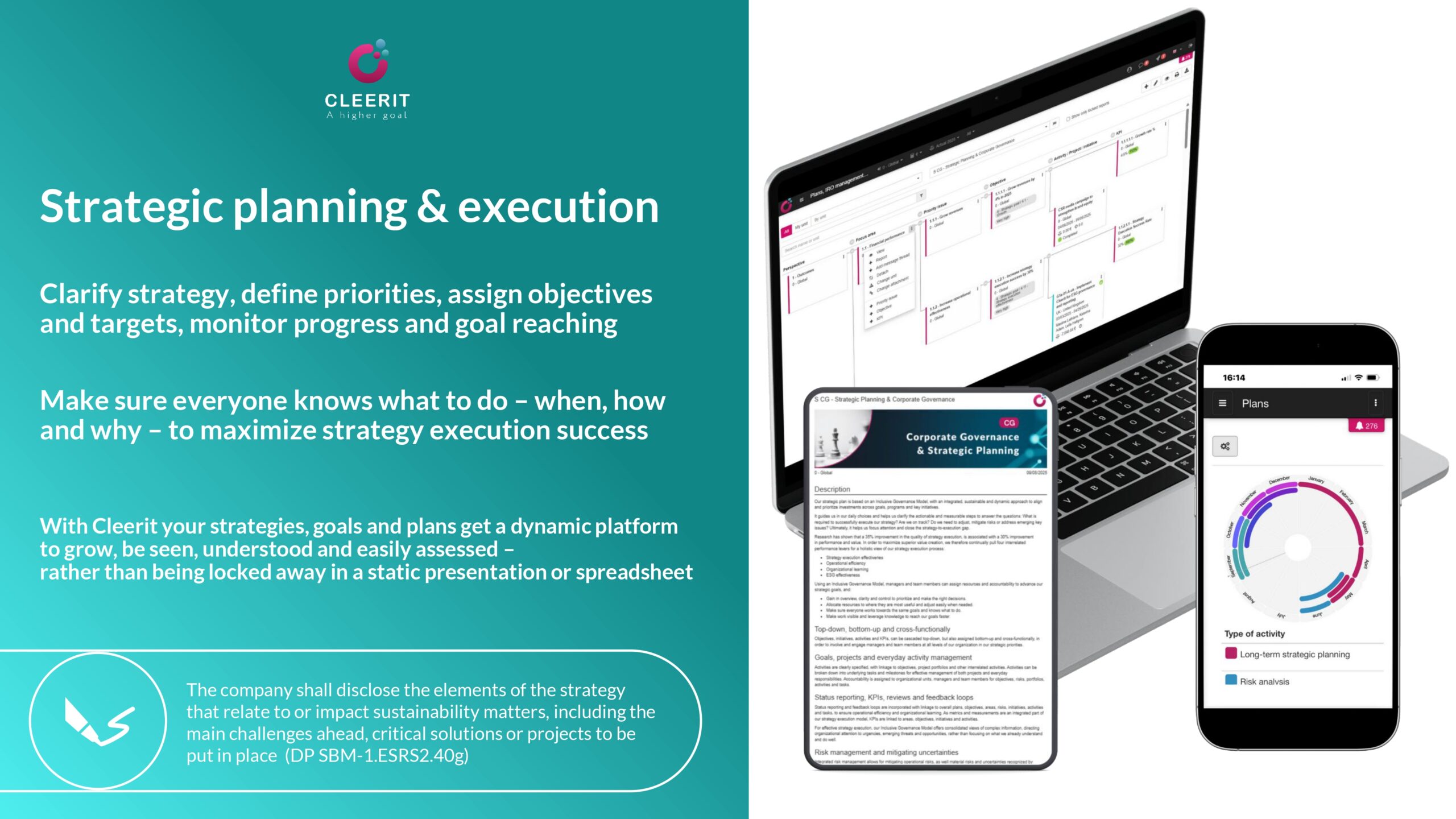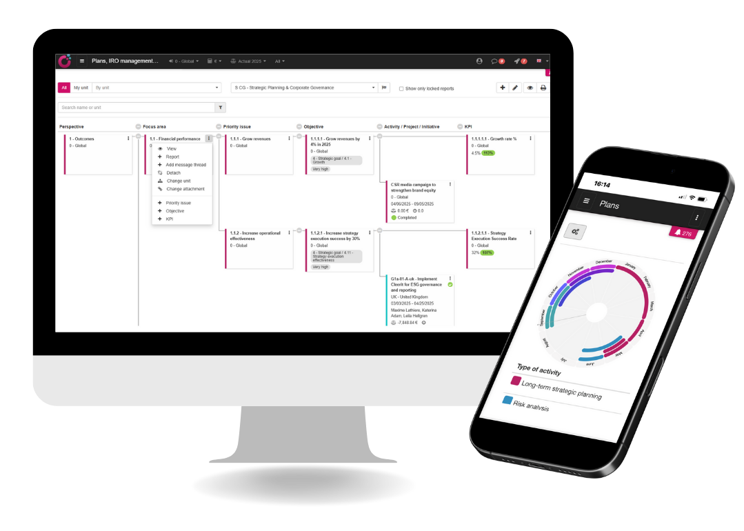 Develop and execute your ESG strategy, integrate it with your core business strategy, and gain in overview, clarity and control to prioritize and make the right decisions