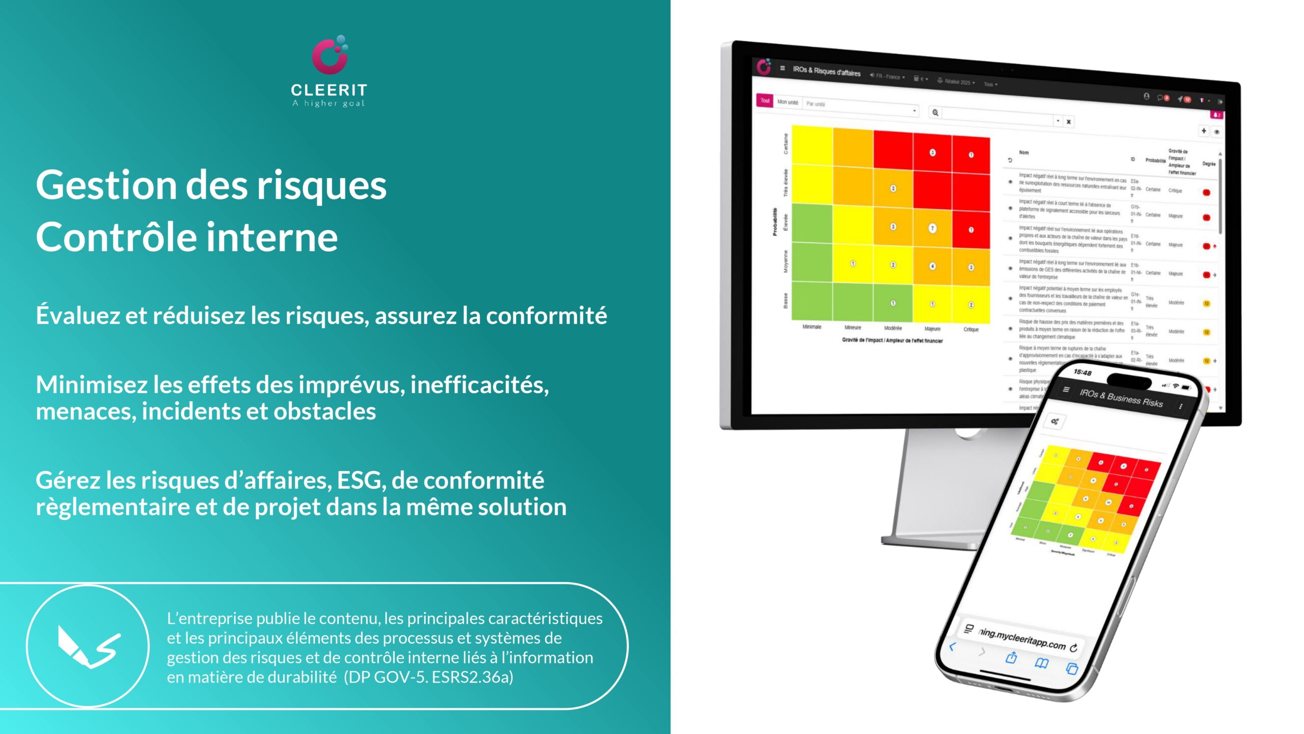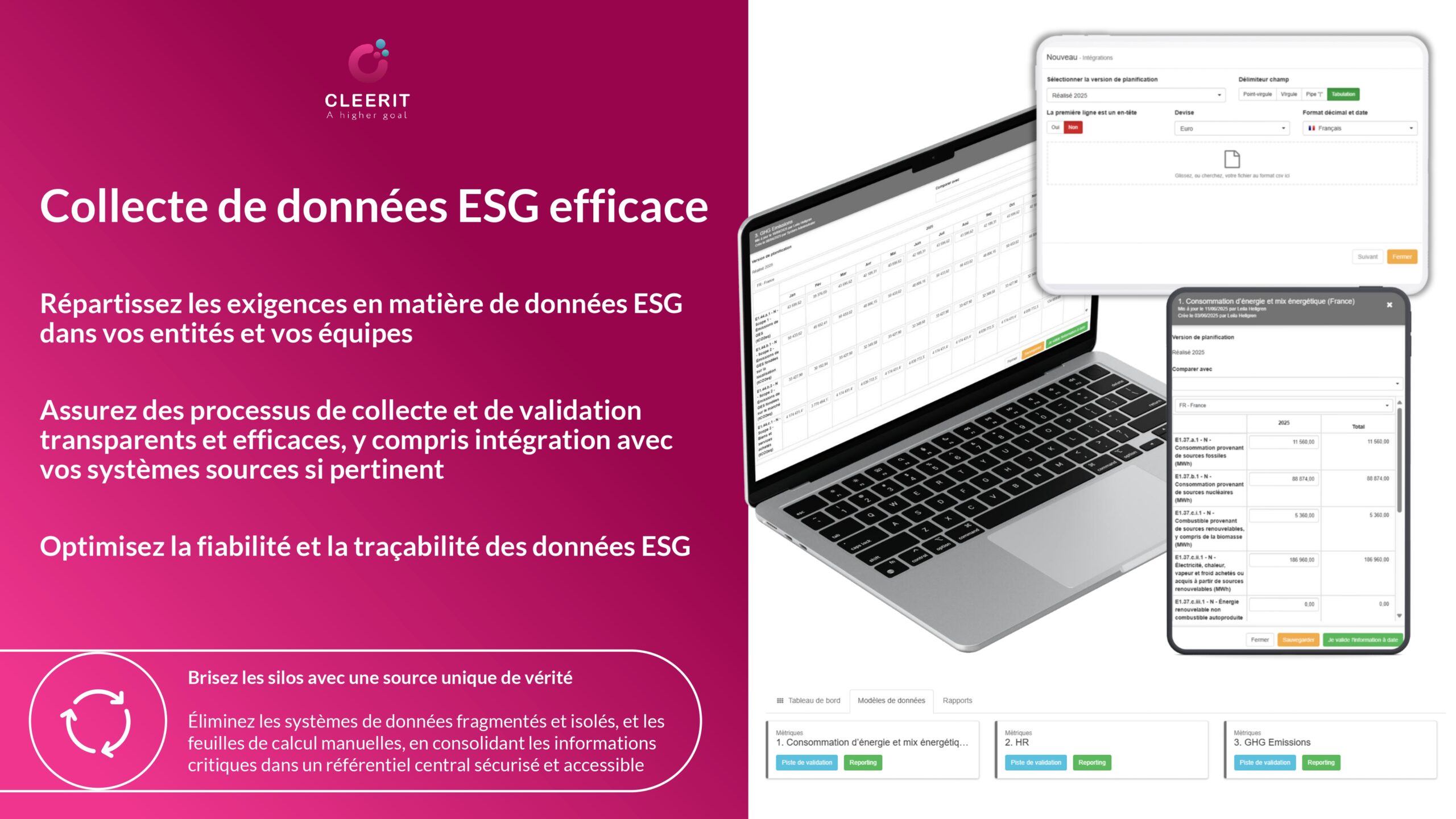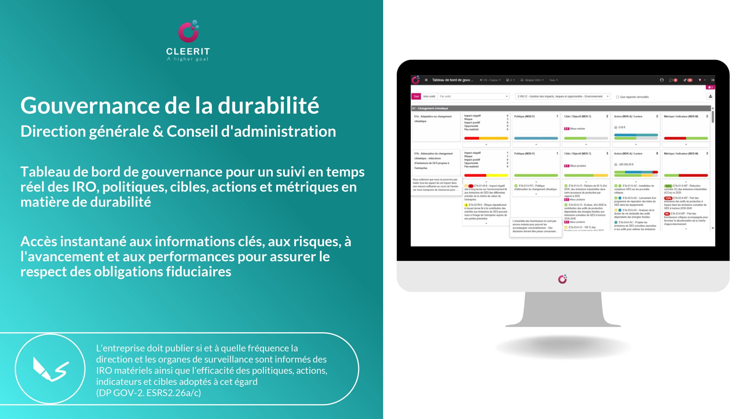 Grâce à son approche holistique, la solution Cleerit ESG permet à l’entreprise de relever ces défis et à intégrer les enjeux sociaux, environnementaux et de gouvernance au cÅ“ur de sa stratégie et de ses décisions.