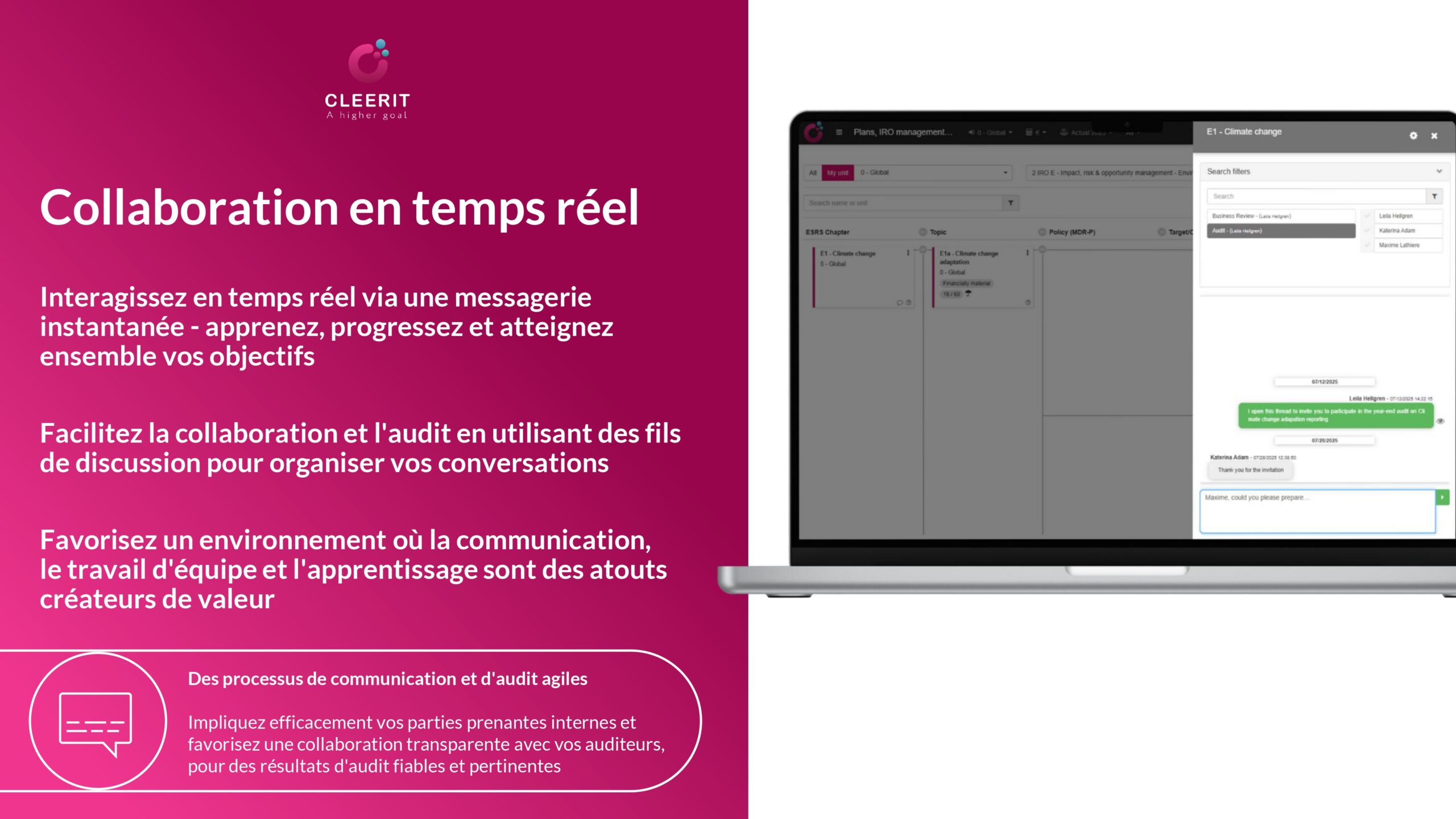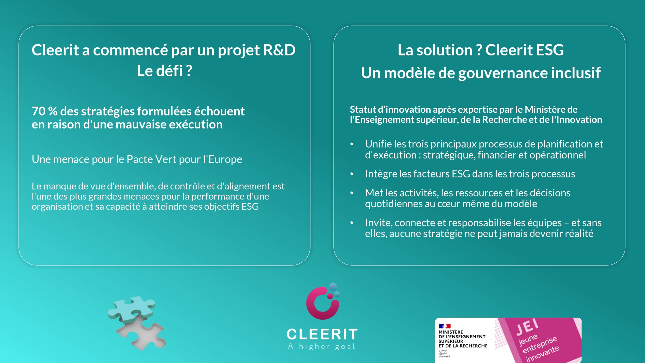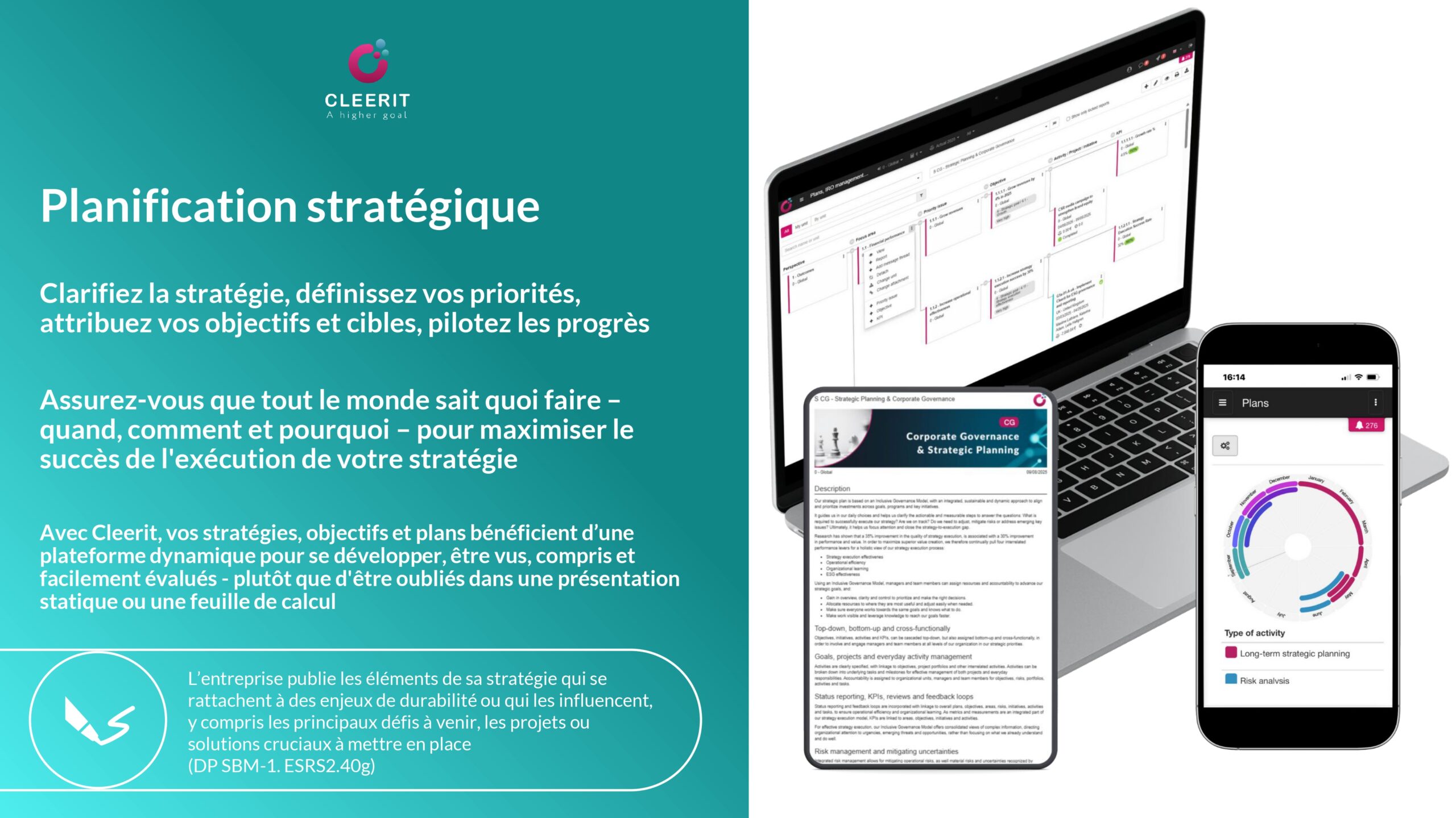 Grâce à son approche holistique, la solution Cleerit ESG permet à l’entreprise de relever ces défis et à intégrer les enjeux sociaux, environnementaux et de gouvernance au cÅ“ur de sa stratégie et de ses décisions.