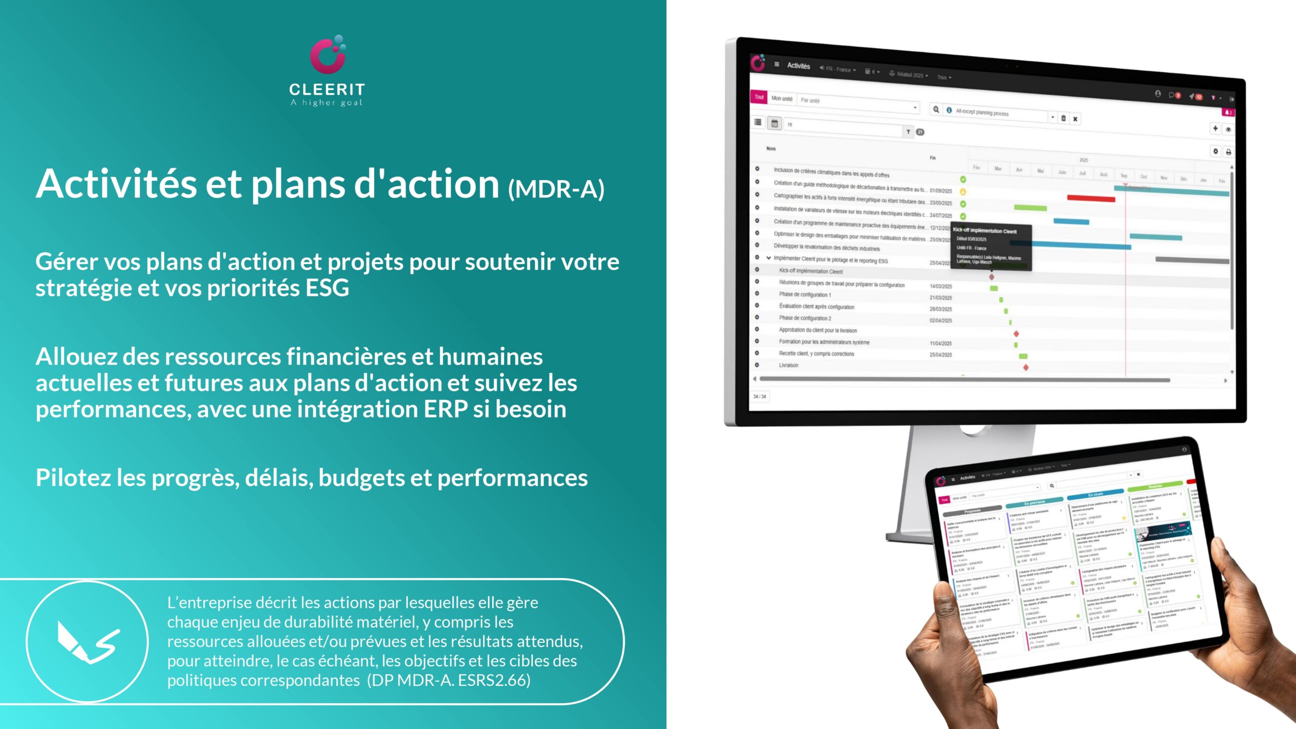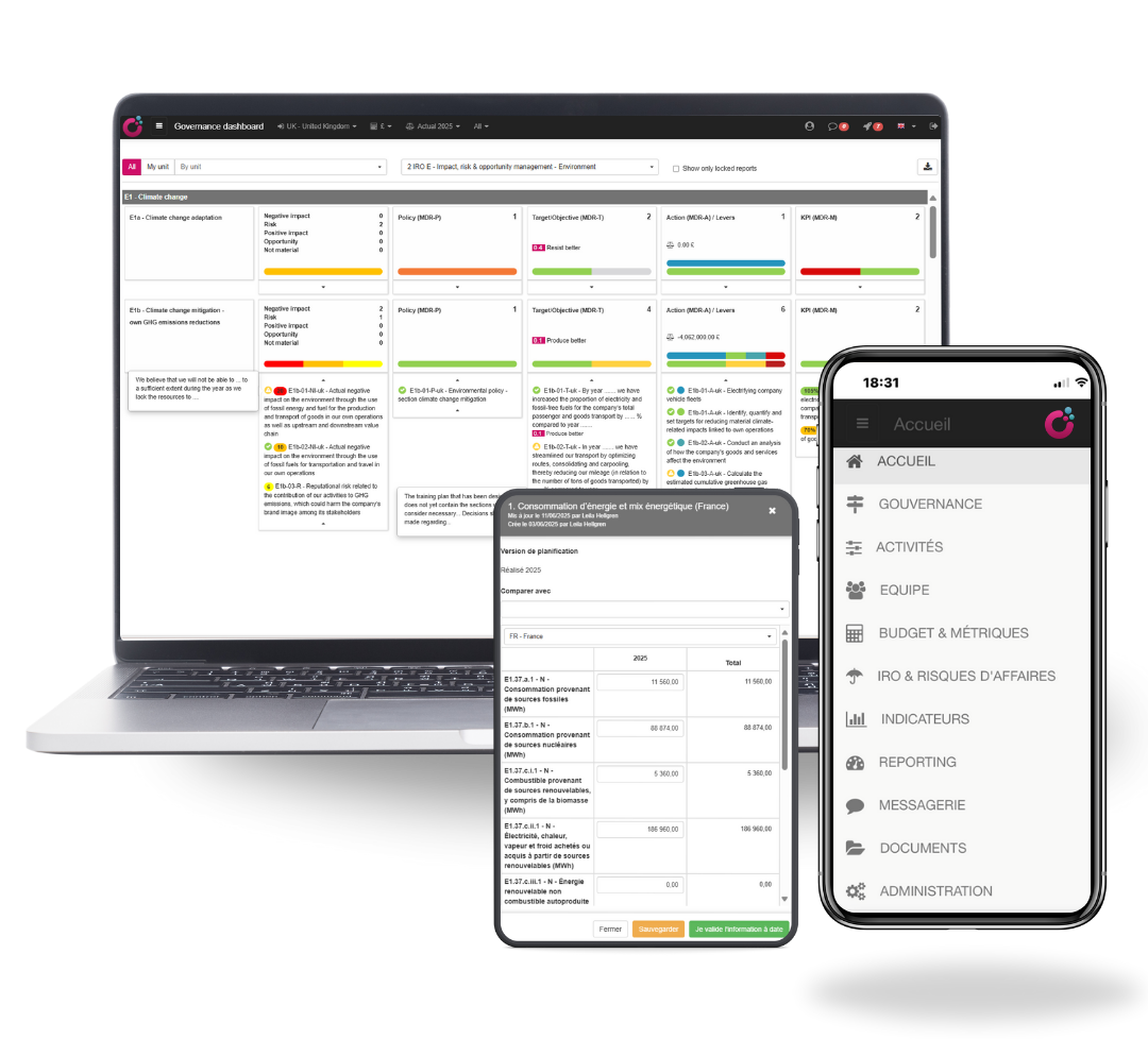 Connectez vos enjeux et IRO matériels à vos politiques, objectifs et indicateurs, et gérez votre feuille de route ESG en pilotant vos actions et vos ressources.