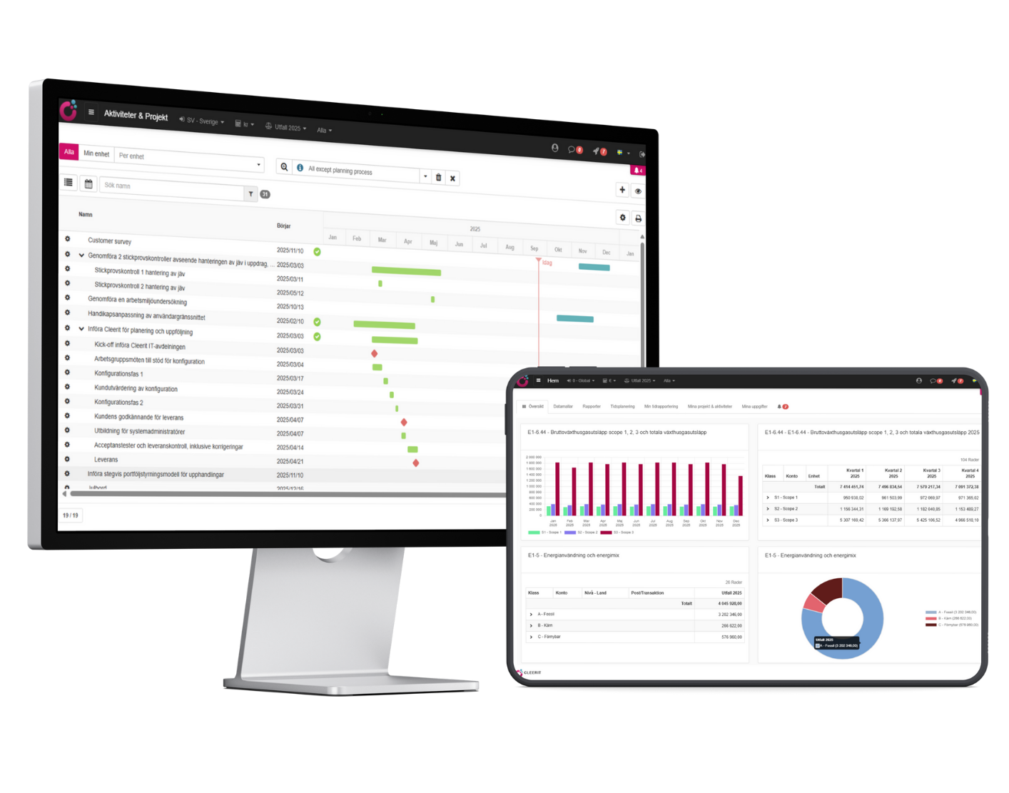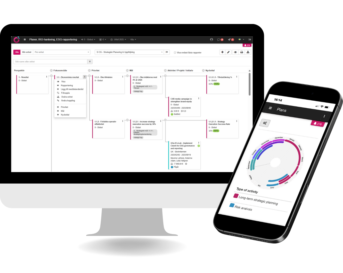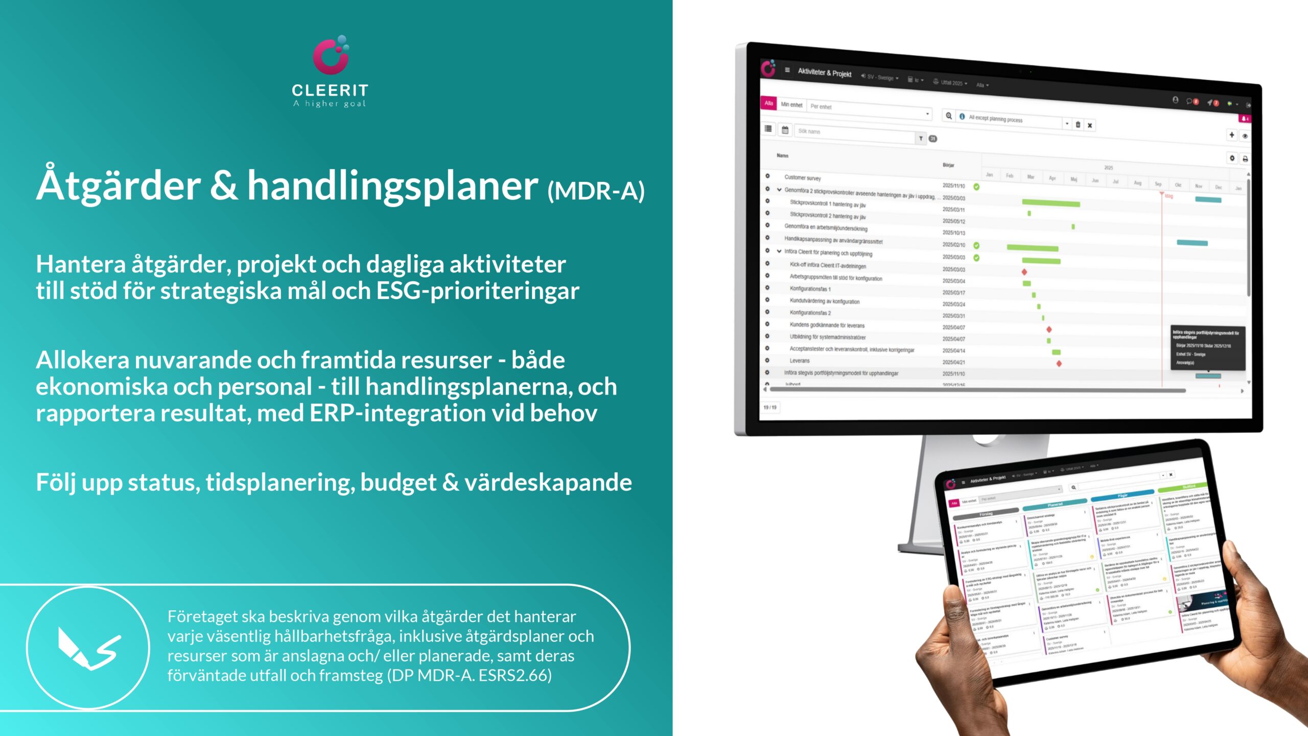 Koppla väsentliga hållbarhetsfrågor till policyer, mål, åtgärder och mått, och hantera din färdplan effektivt med aktivitets-, resurs-, tids- och uppgiftsplanering