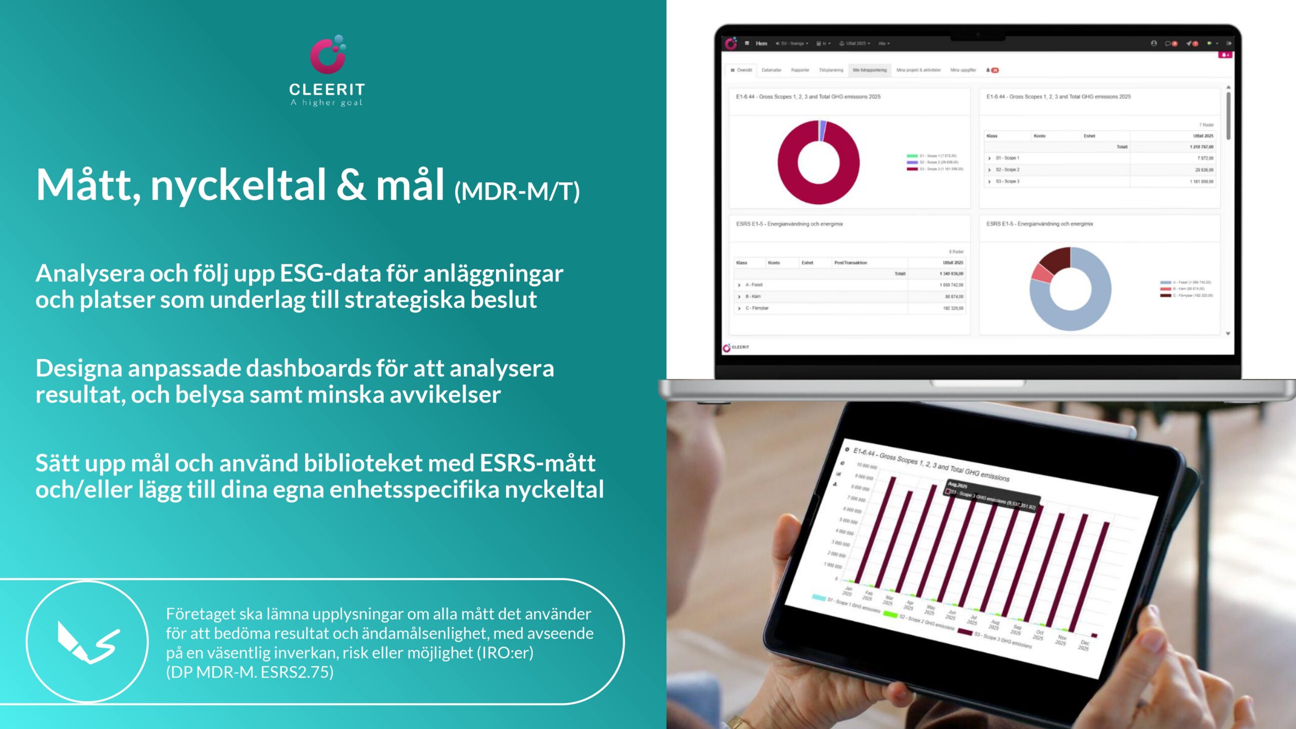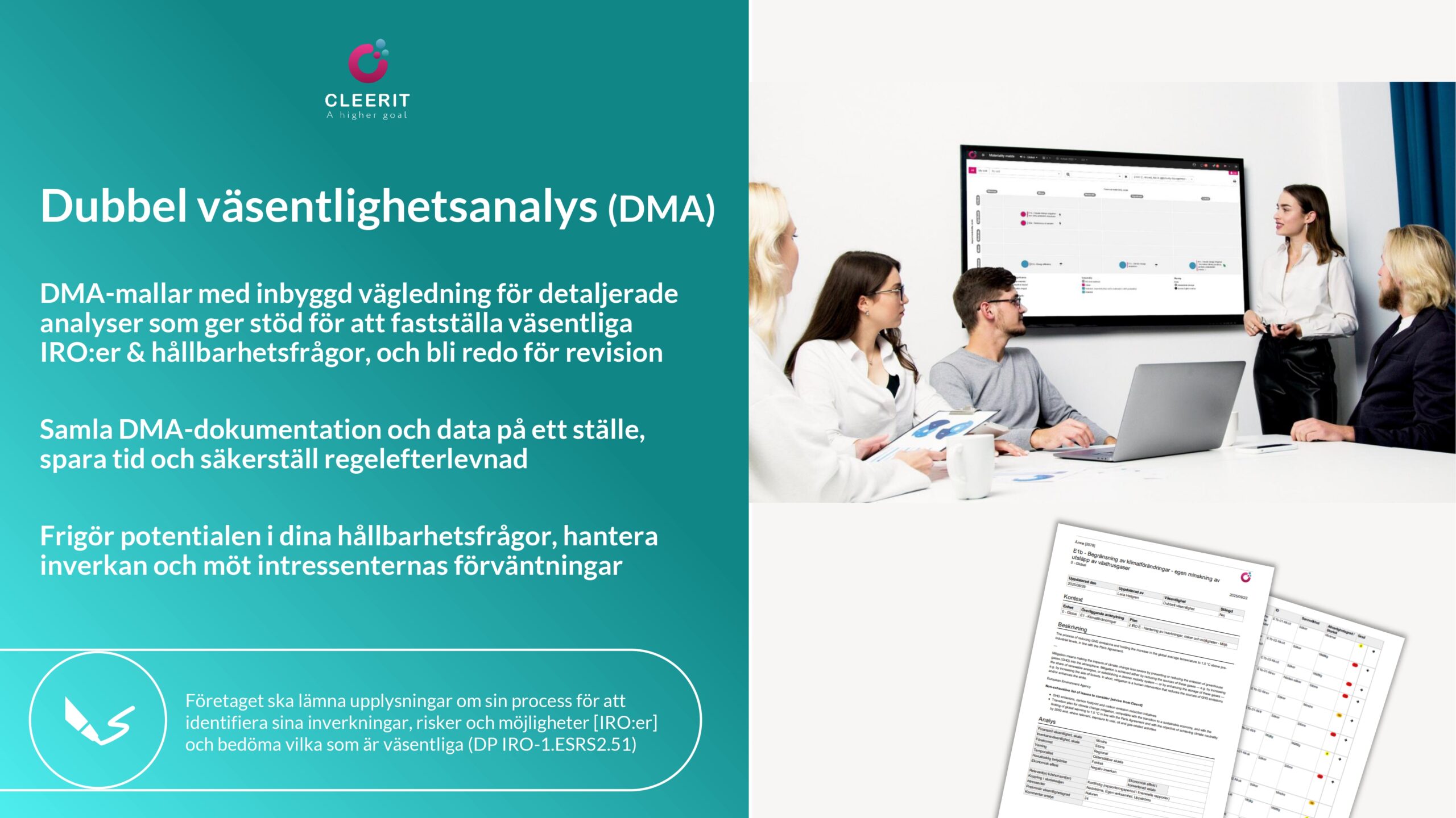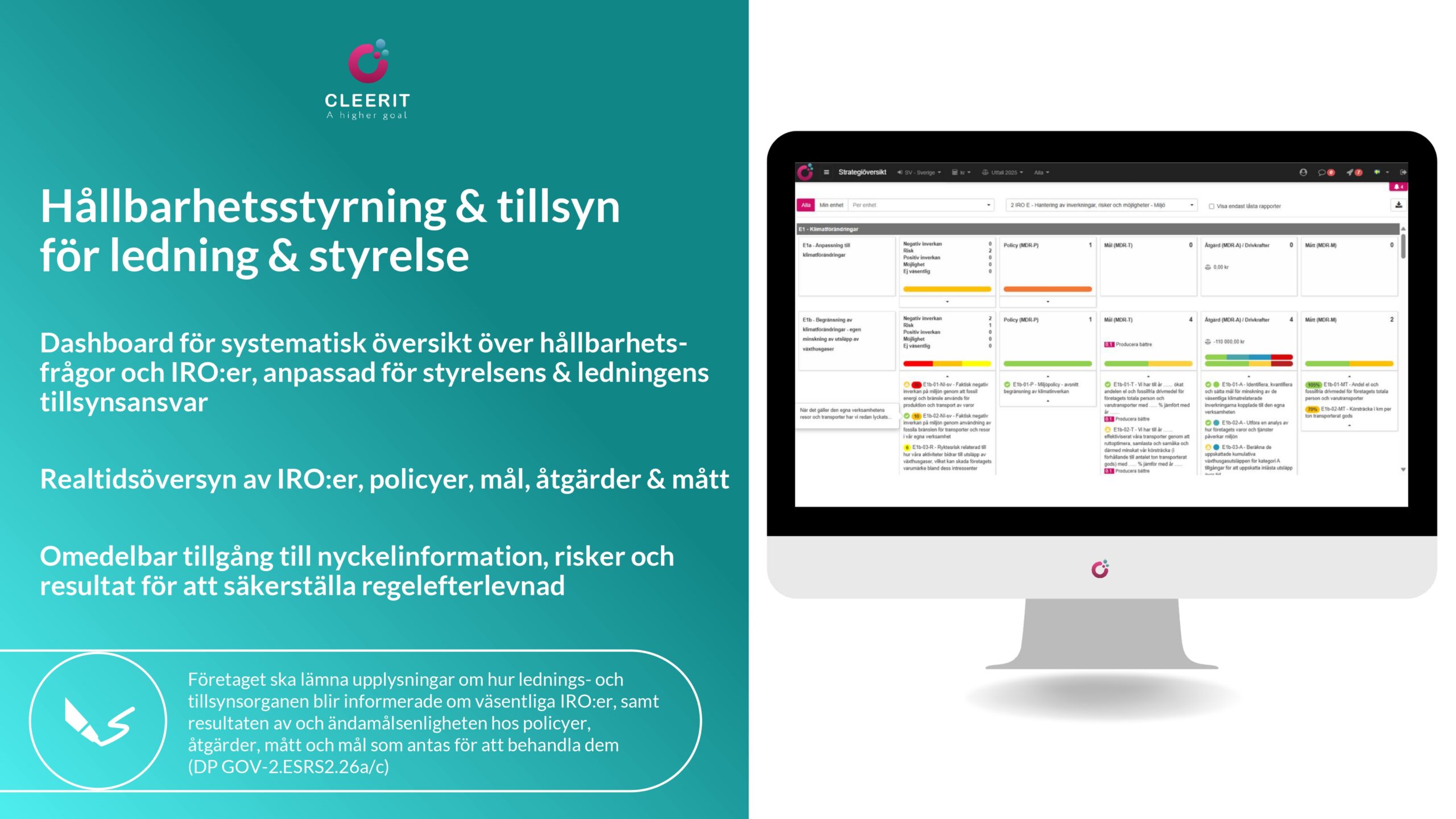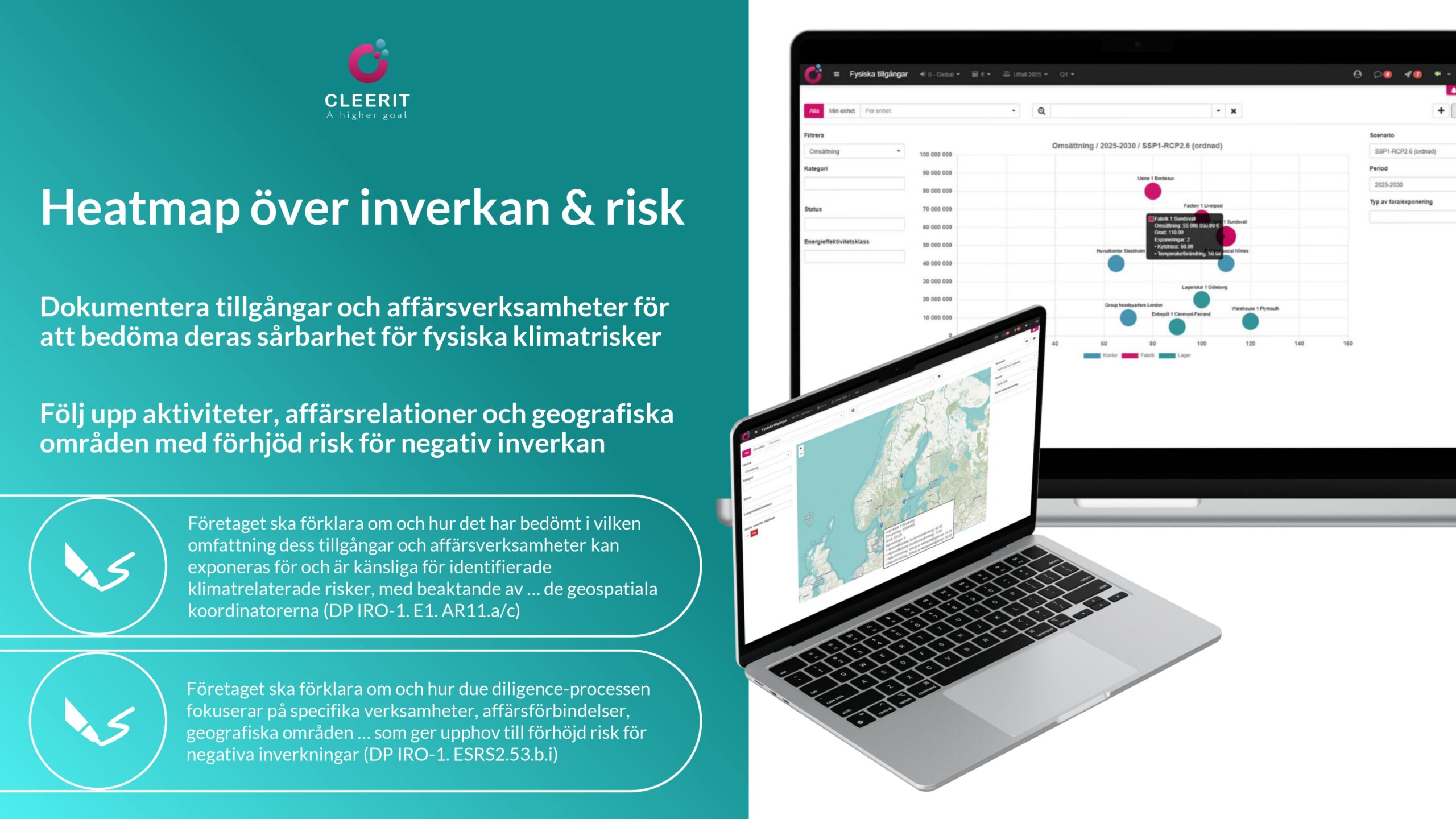 Med en vetenskapsbaserad lösning och helhetssyn är Cleerit ESG unikt positionerat för att hjälpa företag att möta dessa utmaningar, och koppla samman människor, planeten och resultat i centrum för strategiska beslut.