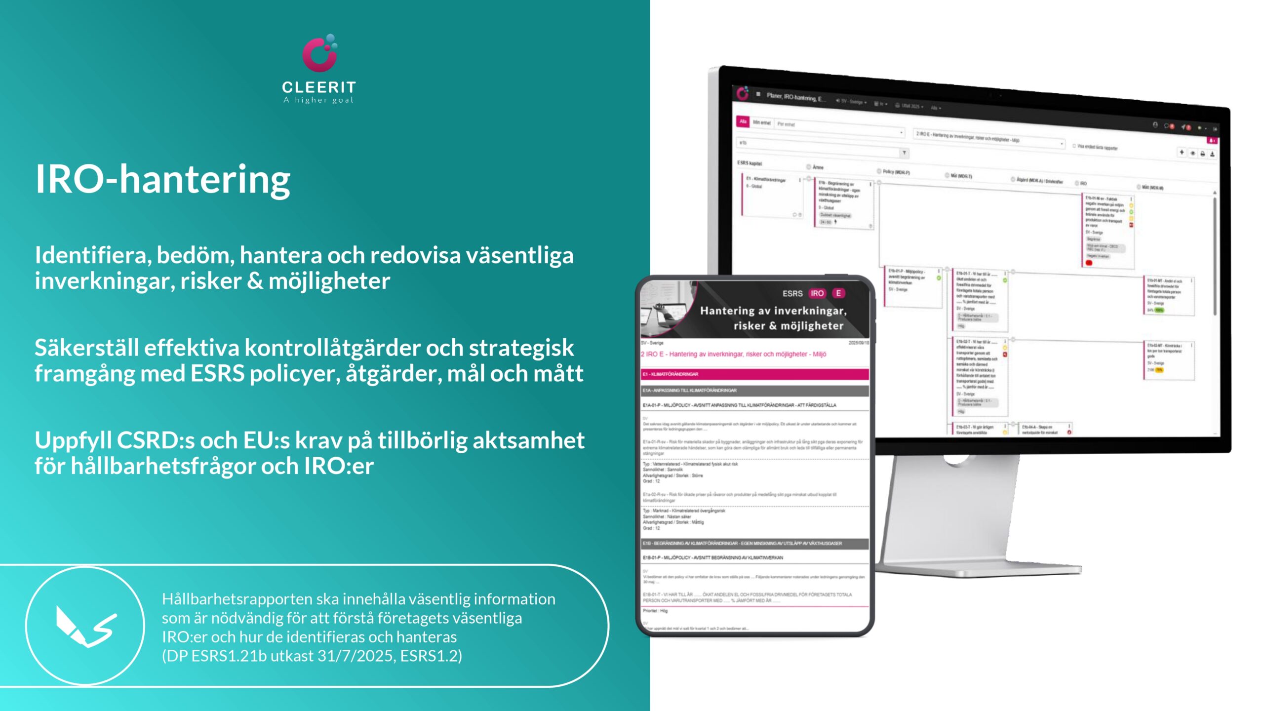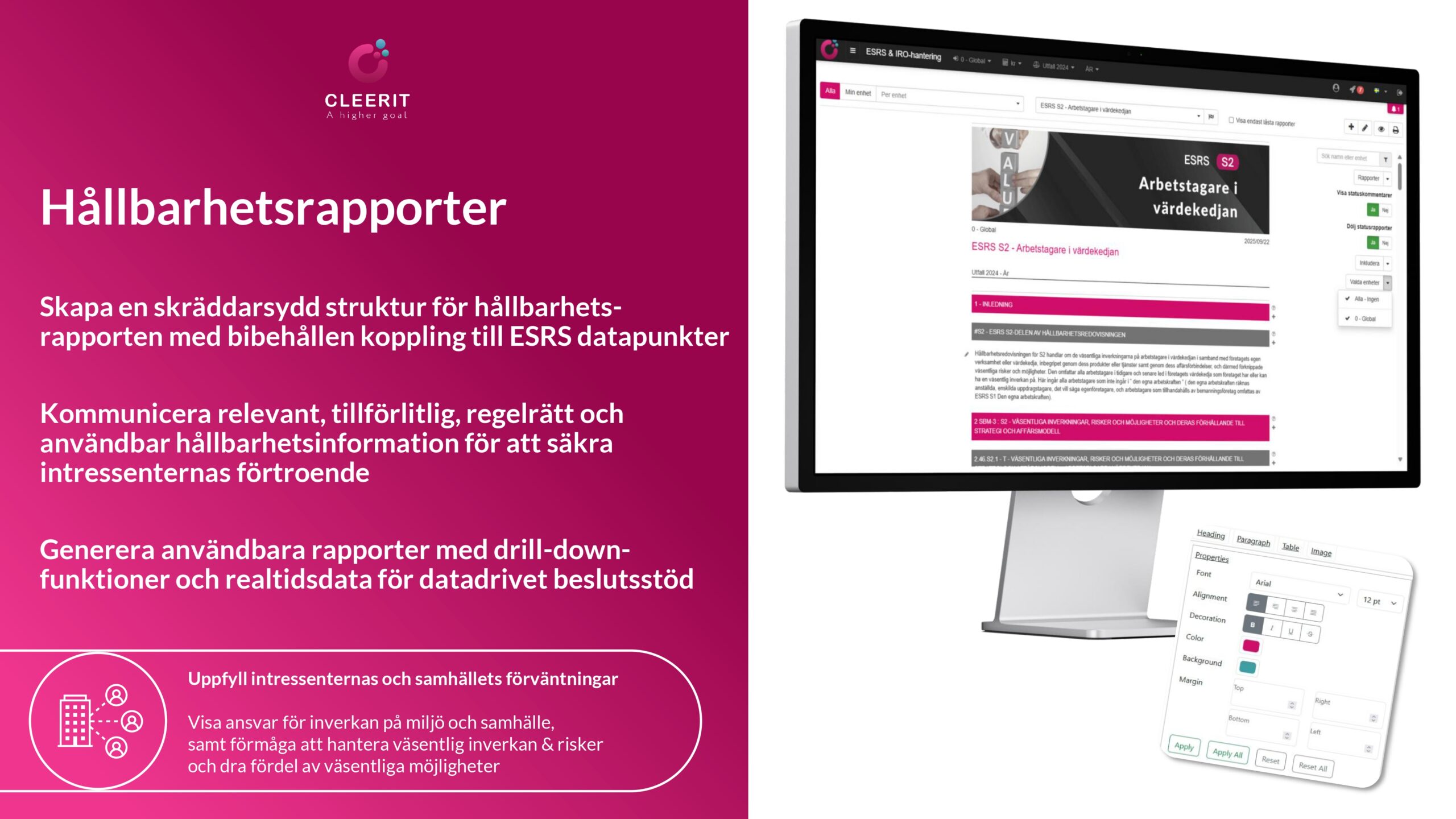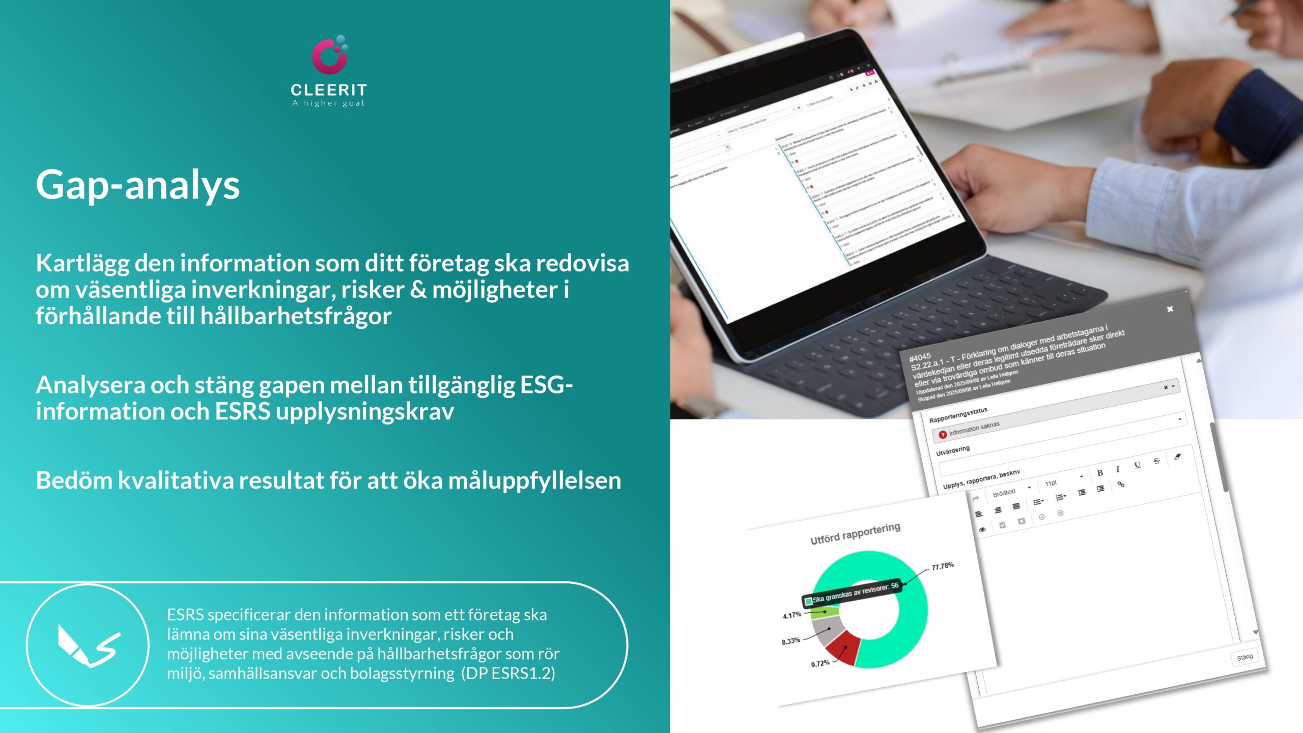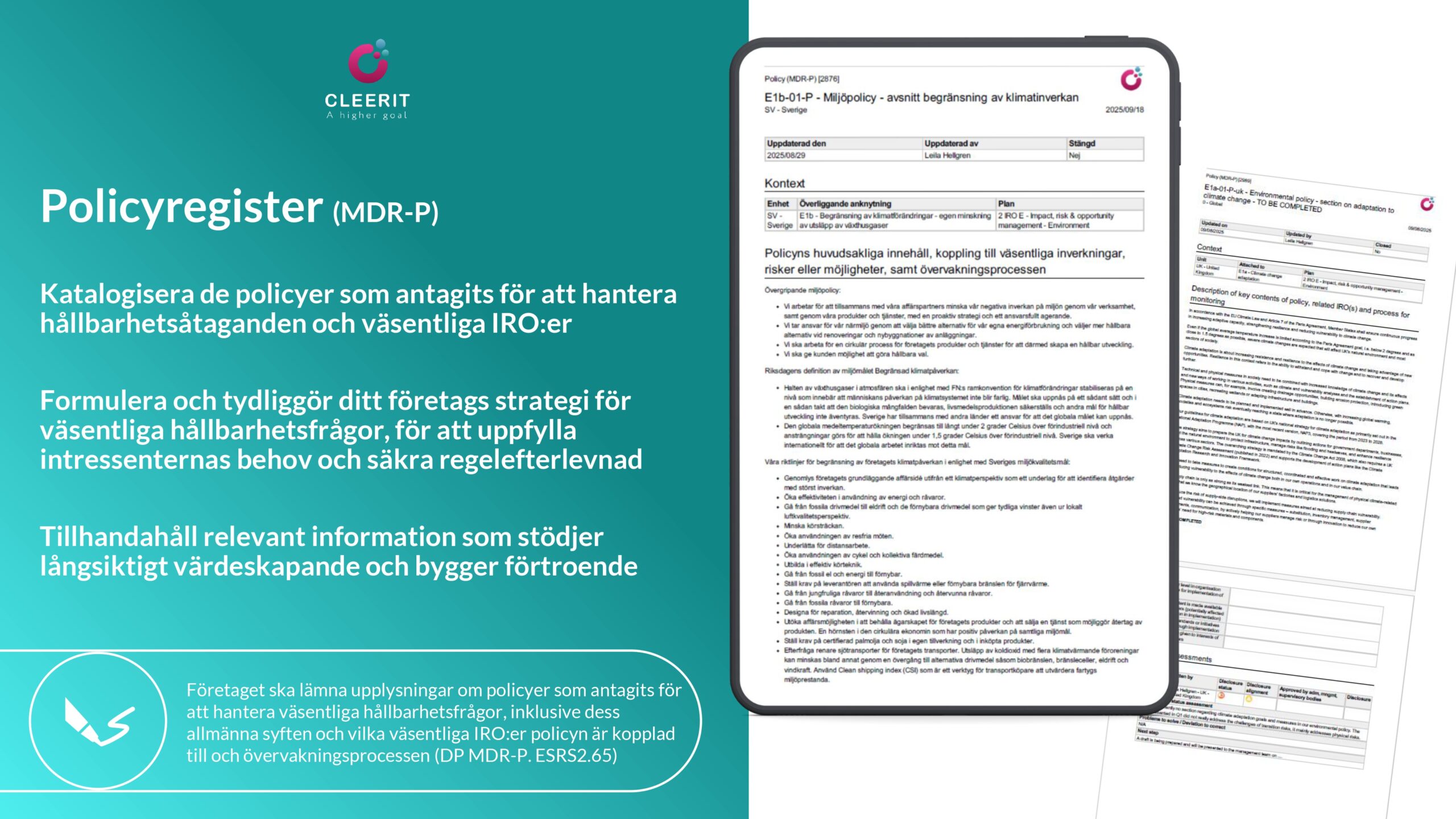 Med en vetenskapsbaserad lösning och helhetssyn är Cleerit ESG unikt positionerat för att hjälpa företag att möta dessa utmaningar, och koppla samman människor, planeten och resultat i centrum för strategiska beslut.