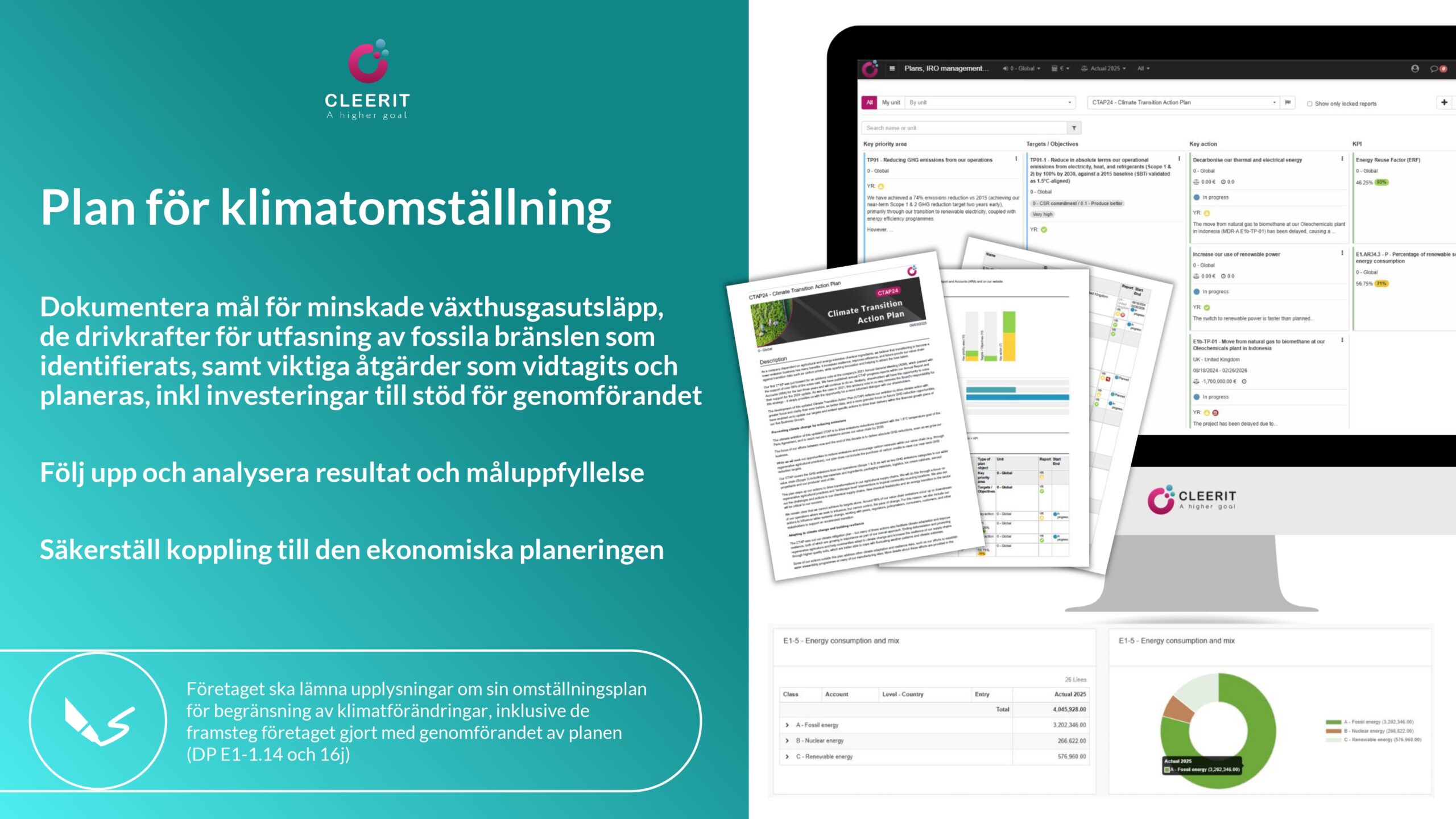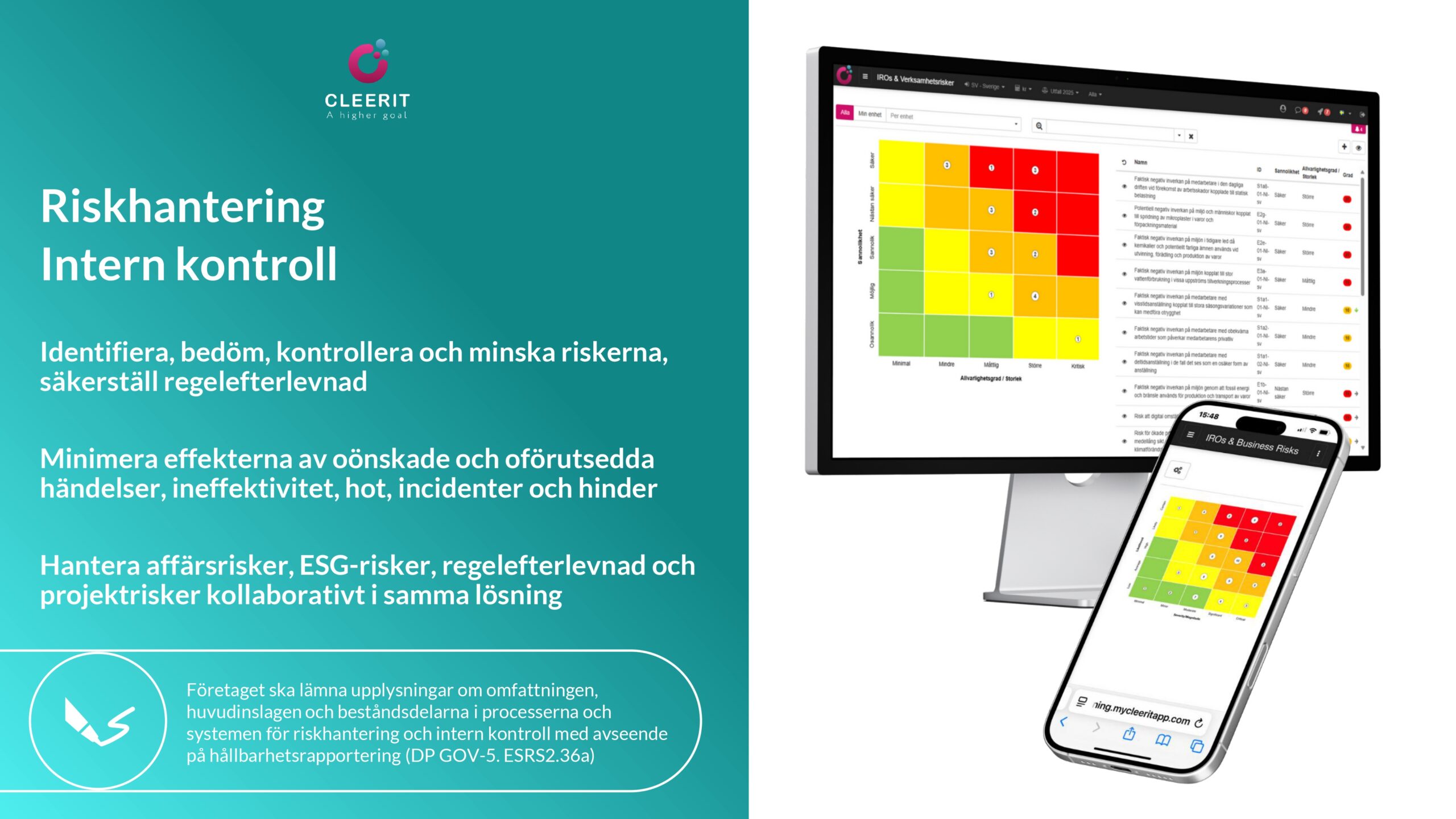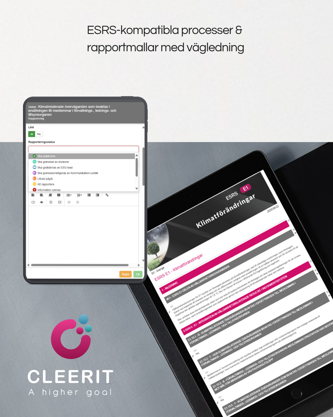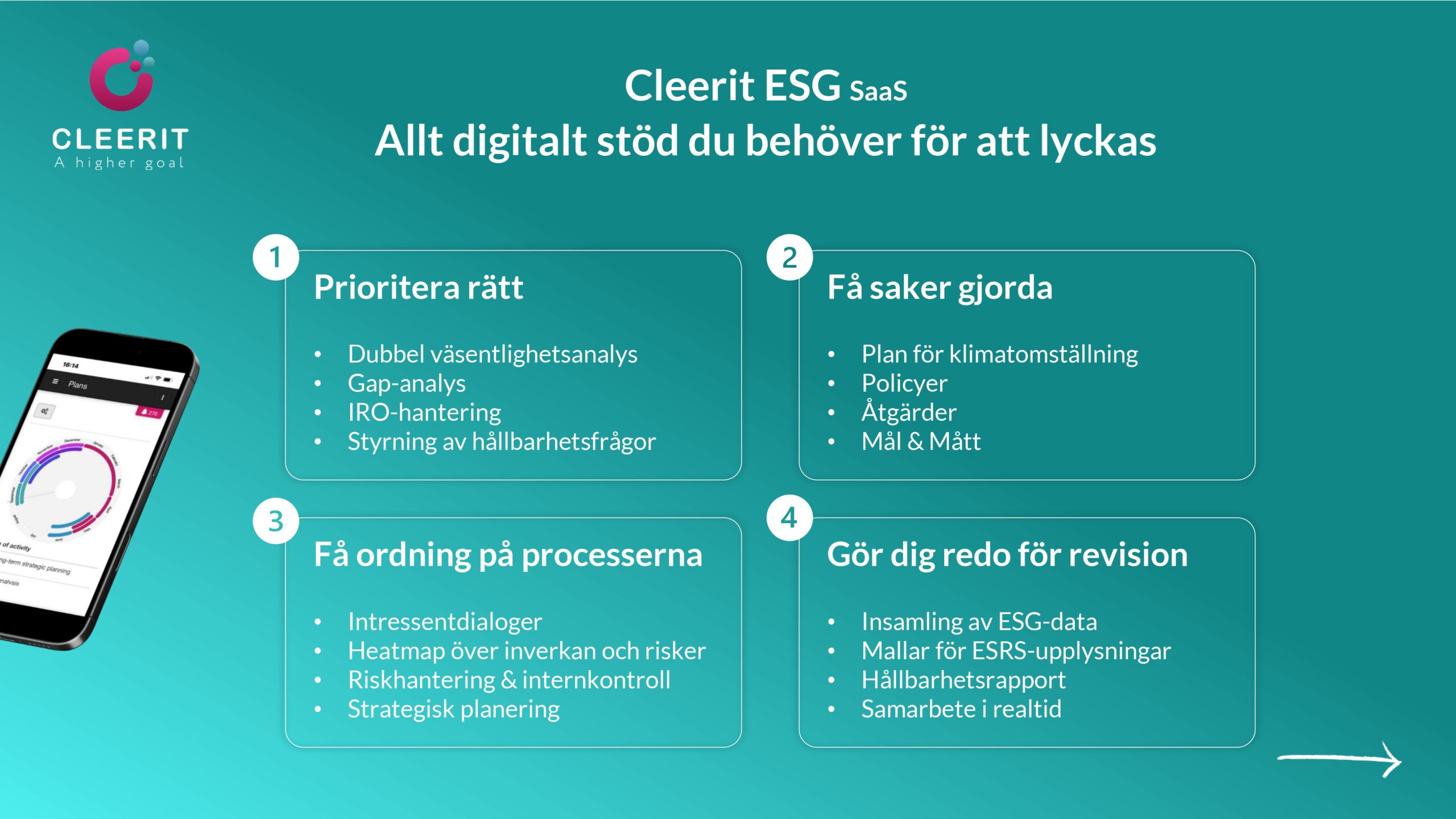 Med en vetenskapsbaserad lösning och helhetssyn är Cleerit ESG unikt positionerat för att hjälpa företag att möta dessa utmaningar, och koppla samman människor, planeten och resultat i centrum för strategiska beslut.
