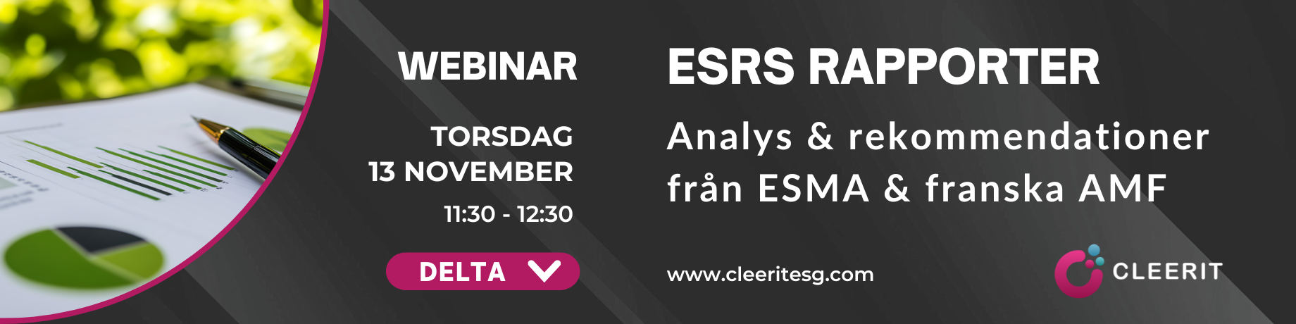 Vi bjuder in till ett kostnadsfritt webbinarium på svenska torsdagen den 13 november kl. 11:30 - 12:30 där vi kommer att gå igenom de viktigaste slutsatserna från ESMA:s och AMF:s analyser, som ger dig bra vägledning inför din nästkommande hållbarhetsrapport. Du får även möjlighet att ställa frågor.